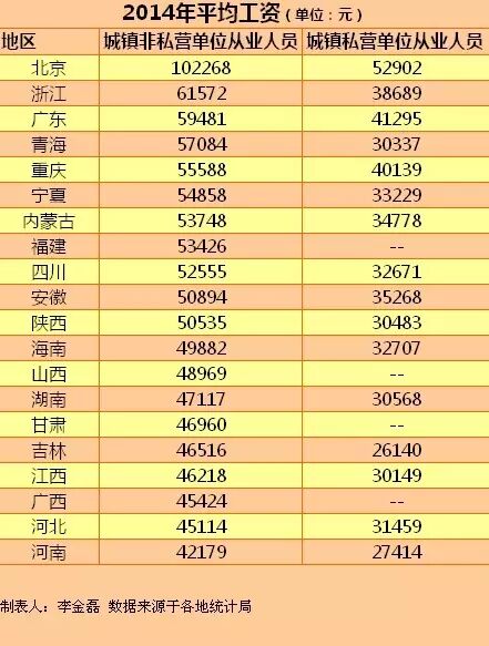 其中,北京市城镇非私营单位就业人员平均工资是目前全国唯一突破10万元大关的地区,这一水平是目前最低的河南省(42179元)的2.4倍。