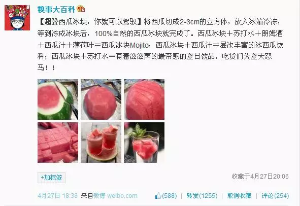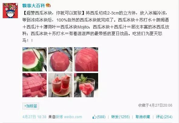 有一个词语叫做望梅止渴,于是小编手贱上微博,看见了糗百发的西瓜冰教程,果断搬过来和小伙伴们分享!嘿嘿嘿,小编看见什么事都想和你们分享,你们就大声说爱不爱我吧!
