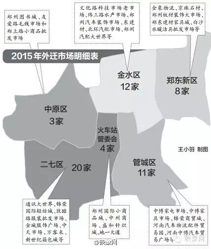 2012年至2013年,有71家批发市场从主城区内迁出。2014年,郑州市共计有48家批发市场外迁。不到三年的时间,三分之二的老市场从中心城区搬离。