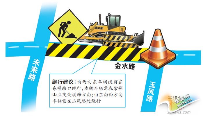 绕行建议:由西向东车辆提前在东明路口绕行,左转车辆需在紫荆山立交处调转方向;由东向西方向车辆需在玉凤路处绕行