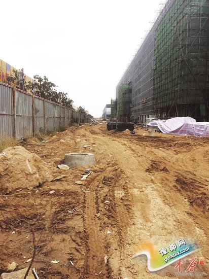 记者昨日在现场看到,工地施工区域被封闭围挡挡住,但围挡内的道路未硬化,一片黄土。工地大门口的冲洗设备形同虚设,大门口地面上有厚厚一层黄土。