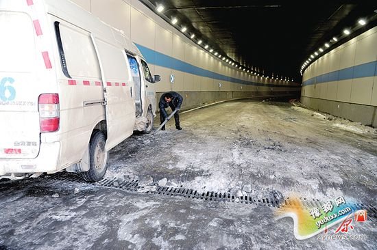 又讯(记者 周甬 文/图)昨日10点,红专路下穿中州大道隧道入口处因积雪没有及时清除,形成约20米长冰道,一辆面包车车轮陷到冰坑里无法拔出,司机正在车下试图铲除地上冰雪。