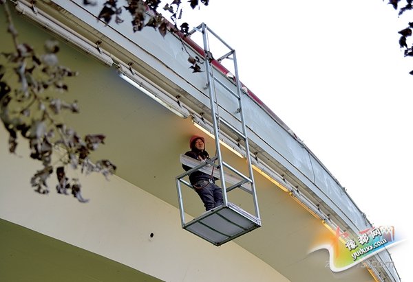 立交桥上主要有两种灯具:一是侧壁灯,二是护栏灯。护栏灯安装起来比较顺手,而侧壁灯位于立交桥下边,施工难度较大。为解决这个难题,郑州市城市照明灯饰管理处研制了50多个特殊的设备——吊篮。
