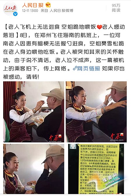姑娘真美!河南老人飞机上无法进食 空姐跪地喂饭