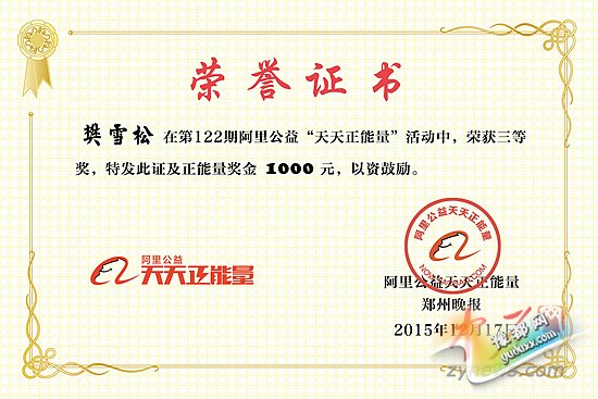 最近,阿里巴巴公益项目看了中原网的报道后,联合我们进行了“天天正能量”评选。在对众多参评报道作品进行调查后,第122期正能量每周评奖出炉,樊雪松获得三等奖,并奖励正能量奖金1000元。