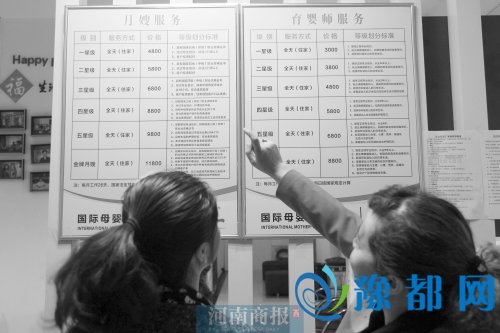 家住郑东新区的赵女士预产期在今年5月份,她在年前就预订好了一位月嫂,“是好朋友介绍的,之前在医院做护士,会做月子餐,照顾孩子也特别专业,一个月8000元。”