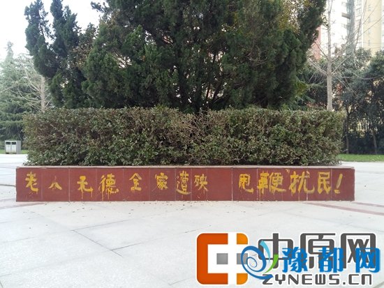 “越往上越响,冬天谁想早起,外边又是跳舞又是甩鞭子,肯定受不了啊!”保安说,冉秋苑小广场花坛上黄色油漆字迹“音量放低”“甩鞭扰民”“老人无德全家遭殃”和 惊叹号,都是3号楼业主气愤冲动时写下的,言辞激烈但似乎并没有什么效果。