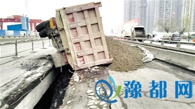 记者看到,发现事故的区域位于航海路与中州大道向东约300米路南的机动车道上,遭遇碾轧出现坍塌下陷的水泥梁长度约10米、宽度在半米左右,凹陷位置卡住大货车的右侧车轮,致使大货车向右侧翻倒,所运载的沙石多半倾覆在桥面上。