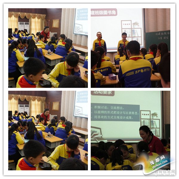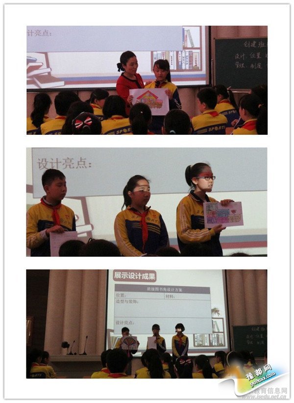 杨娟老师执教的《创建班级图书角》这一选题,内容新颖,具有较高的活动价值。在“倡导全民阅读,建设书香社会”的大环境下,我校也致力于推进“书香校园”的活动建设,营造乐学多思的班级文化氛围,促进学生快乐阅读,提升学生的主人翁意识。在教学过程中,杨老师以书香阅读导入,恰当地调动了学生参与课堂的兴趣。接着,各小组展示课前搜集整理的关于图书角的资料。在展示交流的基础上,小组同学借助搜集整理的资料,联系实际,共同对图书角进行创造性的构思设计。最后,各小组展示交流设计并提出自己的建议。整节课,学生精彩的发言贯穿始终,时而是热情的赞美,时而是中肯的建议,时而是真切的感受,为课堂增色不少。