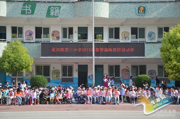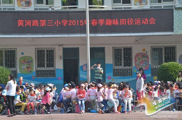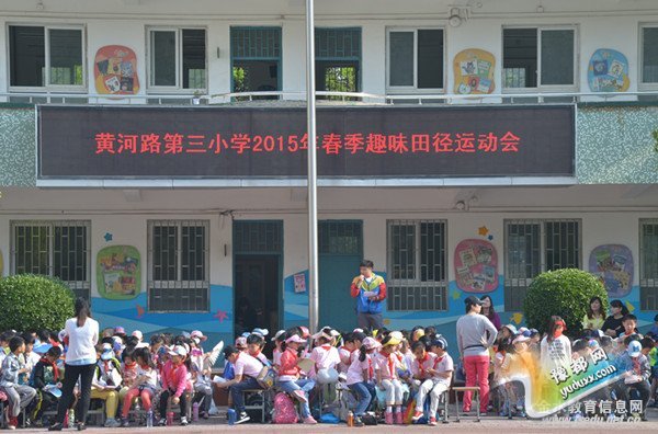 2015年4月29日,春意盎然,艳阳高照,黄河路第三小学以主题为“我运动、我快乐、我成长”的春季趣味田径运动会开幕了。今年学校因扩建综合楼,场地有所限制,为了让每一个孩子都能参与运动会,感受运动的快乐,根据孩子们的年龄特点,体育组精心设置了50米、两人三足、趣味障碍接力、混合接力等比赛项目。