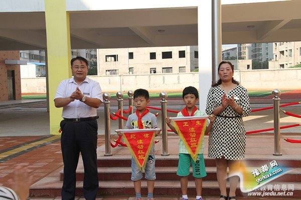 八点整,升旗仪式正式开始。校园一片肃静,在激昂的国歌声中,鲜艳的五星红旗冉冉升起,高高飘荡在校园上空。之后,白叶妮书记作新学期讲话,回顾了抗战胜利70周年震撼人心的阅兵场面,提出了新学期对教师、学生新的要求和新的希望。同时布置了即将到来的“教师节”班级主题活动。随后,德育处总结和表彰了上周表现优秀的班级,并由领导为优秀班级颁发了流动红旗。