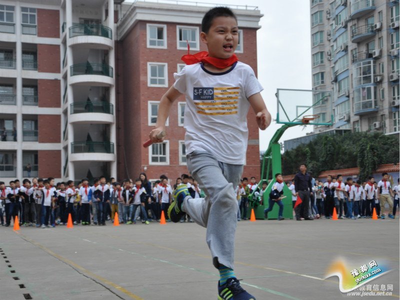 大课间展示结束后是全校的迎面接力比赛,这是展示集体风貌的一项体育运动,全校46个班级分年级比赛,呐喊声、欢呼声此起彼伏。最精彩的要数一年级和六年级的比赛了,别看一年级的同学年纪小,但他们的集体主义观念可不输给学校的大哥哥大姐姐们。参赛的队员积极准备,没有参赛的同学帮大家看衣服,拿水杯……而六年级的同学呢,他们速度快,配合默契,掉棒几率小,成了校园的运动明星……