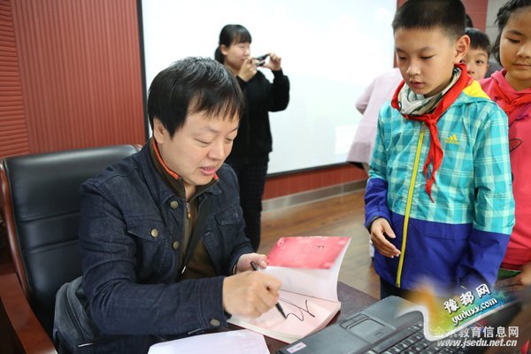 会场里,杨鹏老师就自己写作的绝招与孩子进行了分享。他以其幽默、诙谐的语言,赢得了孩子们的阵阵掌声。形式多样,内容精彩纷呈,有讲解,有交流,还有孩子们的各种提问和表演,在轻松愉悦的氛围之中,孩子们汲取了写作方面的宝贵知识及生活中浅显却深刻的道理。互动结束,小粉丝们纷纷求大作家的亲笔签名,场面热闹,令人感动。