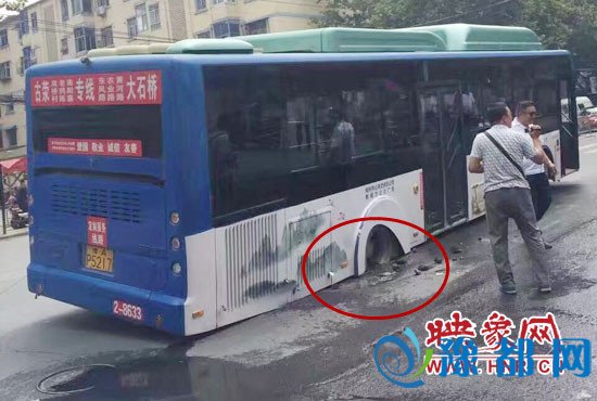 现场市民称,目前公交车底盘已经压到了地面上,车上乘客已经被疏散,没有人员伤亡。