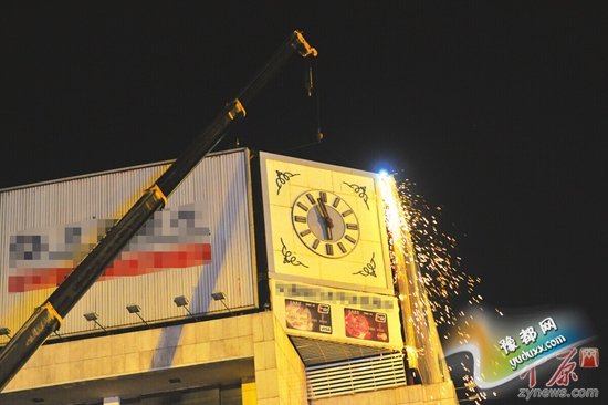 昨晚8时20分,凛冽的寒风中,执法人员及施工车辆进入现场。晚10时15分,切割机开始对中间最小的一块牌进行切割。晚11时左右,第一块牌被卸掉。随后,工人们依法对设在楼顶的其余翻转牌逐步实施拆除。因为如此大的牌,必须切割成小块才能拆掉装车运走。
