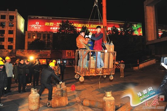 施工人员和气罐起吊