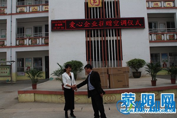 4月28日上午,郑州市昌煜实业有限公司出资10万元,购买45台空调,捐赠给荥阳市索河西街小学,并举行了简单的捐赠仪式。