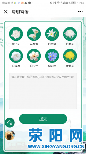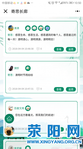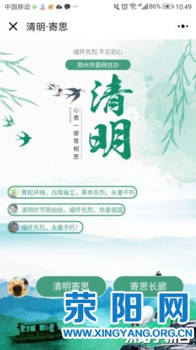 郑州市委网信办创新网络宣传的载体和形式,特别在清明节前推出“清明寄思”小程序,可让网民突破时空的阻隔,实现全天候、全球化的缅怀、寄思,随时随地在网络平台上表达对先烈、已故亲人的缅怀之情。