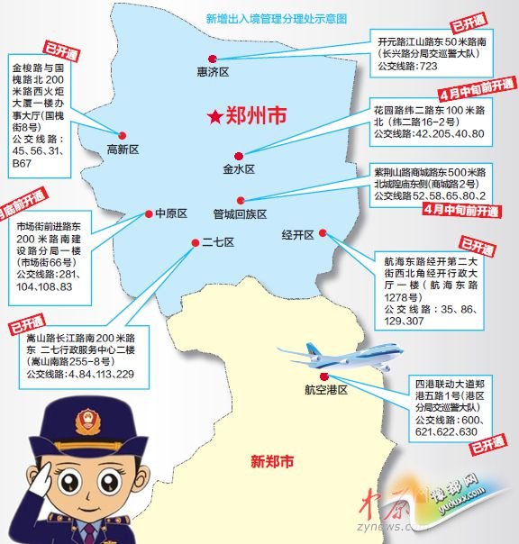 据了解,今年以来郑州警方将“增建出入境管理分理处”作为一项民心工程、中心工作,自3月初在金水路、建设路、嵩山路、商城路、长兴路、高新区、经开区和航空港区等8个城区的公安分局筹建出入境管理分理处(具体地址附图)。经过不到1个月的努力,嵩山路、长兴路、高新区、经开区和航空港区等5个公安分局的分理处已建成完毕,并于3月25日起对外办理业务。