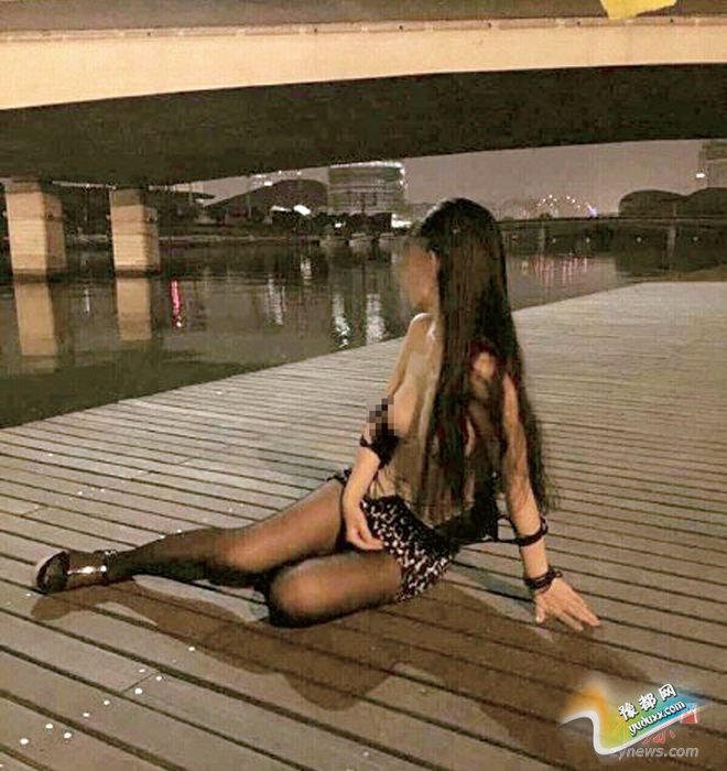该微博一共发布了9张照片。一二三张照片为夜间,一名上身裸露的女子穿着短裙、黑色丝袜跪坐在一河岸边,因河岸为木制地板,看上去与郑东新区CBD运河观光周边的河岸有些相似。