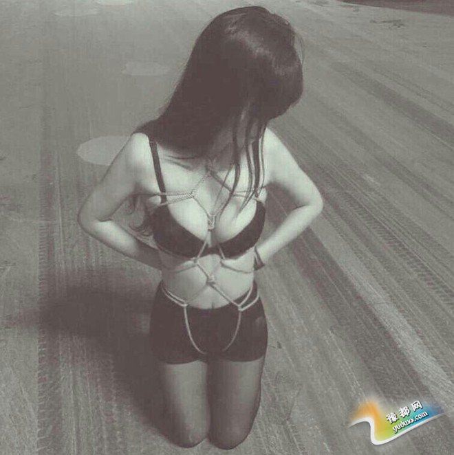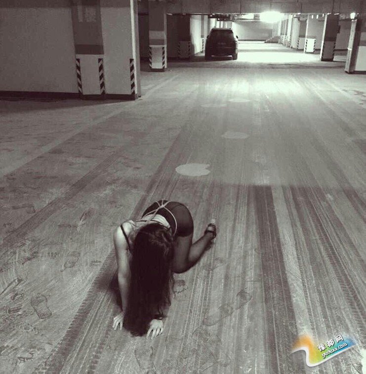 四五六张照片为女子穿着胸罩、短裤和黑色丝袜在一个地下车库拍摄,这组照片虽然女子上身并未裸露,但全身却被绳子五花大绑,其中一张披头散发趴在地上的照片,让人浮想起午夜凶铃贞子的恐怖。