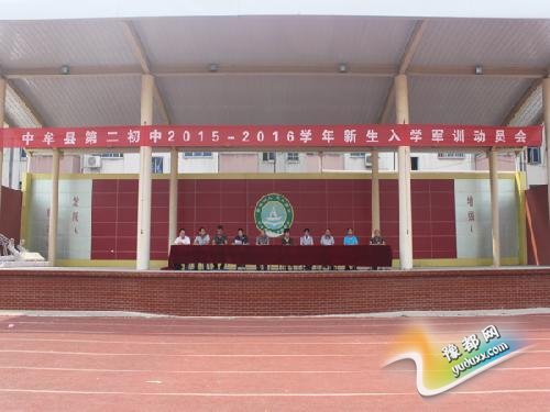 2015年8月24日上午,中牟县第二初级中学2015至2016学年七年级新生军训动员会在学校运动场召开,大会由该校政教处李守彬主任主持。