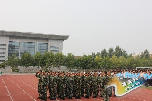 军训典礼首先进行唱国歌、升国旗仪式,开幕式在雄壮的国歌声中拉开帷幕。副校长周书剑发表动员讲话,武警河南总队训练基地首长何仕彦阐述了学生参加军训活动的重要意义。