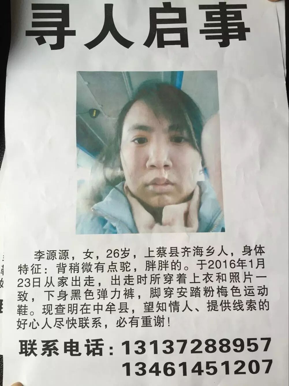 李源源,26岁女孩,上蔡县齐海乡人,身体特征:165cm,稍微驼背,微胖。于2016年1月23日离家,现在有可能在中牟。最后和家人通话时间为1月26日下午4点,大约位置中牟县青年路名吃城附近。离家时上身穿蓝色棉衣,下身穿黑色弹力裤。