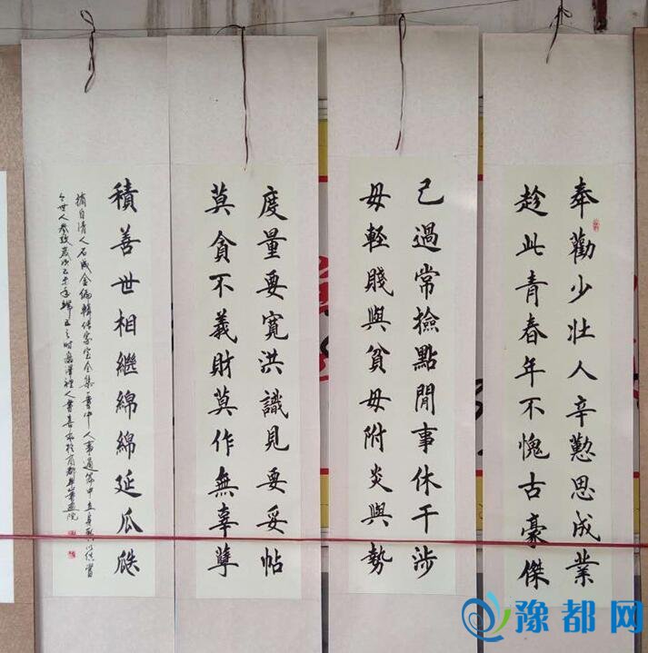 同时王书喜还把书案搬到现场,进行现场创作,有时还邀请几个同行,对自己的作品进行品头论足。市场旁边上就是一个小学,每天放学前后,有不少小学生也在画廊前驻足观看。书法内容既有古诗词欣赏、也有劝世美文,还有作者的心灵感悟,观看起来颇具教育意义。