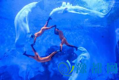 6月6日,在天津海昌极地海洋世界,驯养员与白鲸一同组成“风火轮”造型。当日,天津海昌极地海洋世界全新推出的“白鲸之恋”水下表演首次亮相,表演中三名驯养员和三头白鲸共同演绎的“风火轮”造型惊艳全场,为观众带来美妙的视觉感受。图片来源:新华网