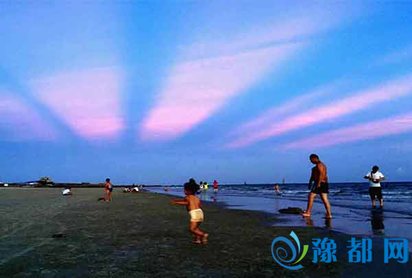 6月27日,广西北海侨港海滩现晚霞奇观。受副热带高压影响,广西连日持续高温天气,而高温“烧”出的晚霞美景美不胜收,不少市民和游客趁傍晚时间赶海消暑,一并欣赏迷人晚霞。图片来源:新华网