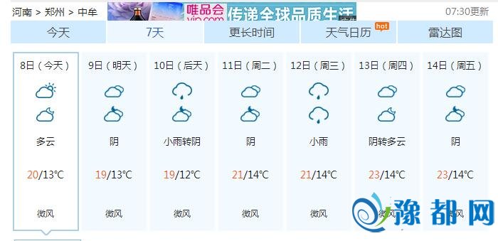 8日夜里到9日白天:多云转阴天,13度到20度;