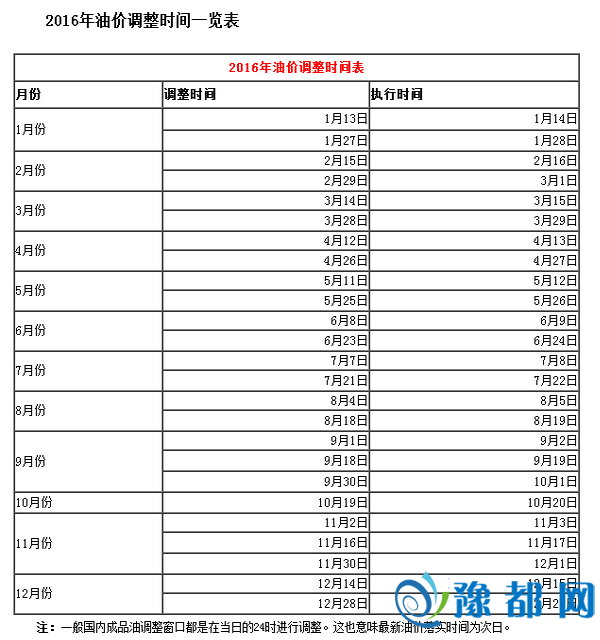 2016年油价调整时间表