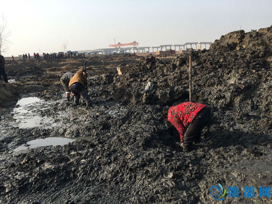 12月1日上午,记者在现场看到,几十米宽的贾鲁河两岸,聚集了近百名村民,坑坑洼洼河滩上都是淤泥。村民们穿着胶鞋把淤泥抓在手里,寻找着里面的“宝贝”。