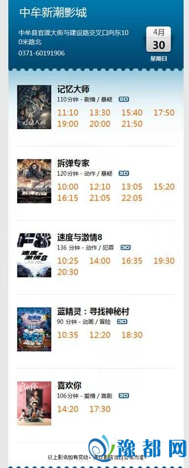 《中牟新潮影城4月30日排期表》由河南新闻网-豫都网提供,转载请注明出处:http://zhengzhou.yuduxx.com/zhongmou/596918.html,谢谢合作!
