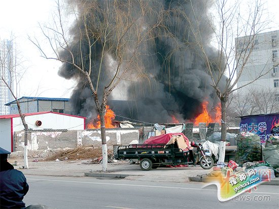 中原网讯(首席记者 徐富盈 文/图)昨日上午,高新区冬青街口一长排民工宿舍发生大火,10多间板房化为灰烬,所幸无人员伤亡。