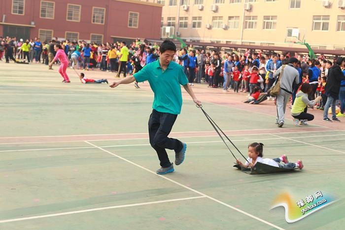 然后,在蛋糕老师的带领下,小朋友们进行了欢快的律动游戏,一首“大章鱼和小章鱼”充分调动了幼儿的参与热情,使运动会气氛瞬间活跃起来。亲子游戏“快乐魔毯”,瞬间把家长和孩子带入到游戏氛围中,由孩子坐在魔毯上,家长拉着魔毯向前奔跑。孩子们大声呐喊“加油!加油!”。